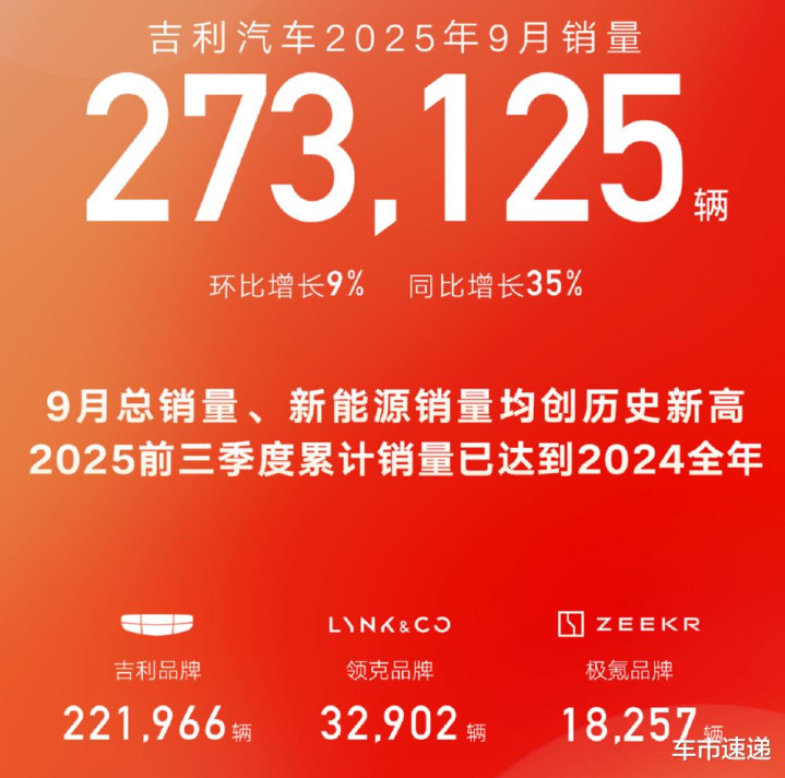 根据吉利汽车公布的销售数据显示,在刚刚过去的9月份,吉利汽车单月销量达到了273125台,同比增长35%,环比增长9%,其中,海外出口40665台;新能源汽车月销165201台,同比增长81%,环比增长12%,创下历史新高度。